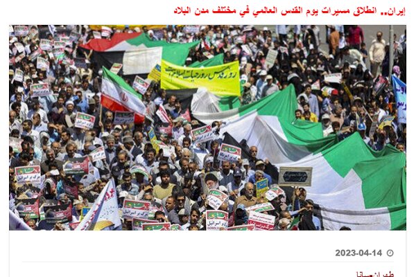 خبرگزاری سوریه هم گزارش داد: راهپیمایی گسترده گرامیداشت روز جهانی قدس به نشانه حمایت از ملت فلسین و در مخالفت با اشغالگران اسرائیلی در تهران و شهرهای مختلف ایران در حال برگزاری است.