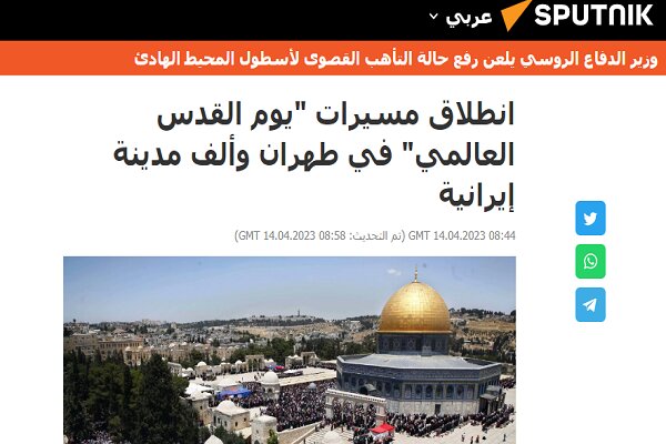 اسپوتنیک روسیه هم ضمن پوشش راهپیمایی روز جهانی قدس در شهرهای مختلف ایران گزارش داد: راهپیمایی روز قدس در تهران و هزاران شهر ایران برگزار شد.